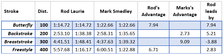 Rod Laurie is a strong butterfly swimmer, and this was immediately evident in the race. Rod’s 100 fly time was 1min 14.72 secs and he gained an advantage over Mark of nearly 8 seconds on the 1st leg. This then left Mark with an enormous amount of serious work to overcame the advantage Rod has established in the 1st leg.