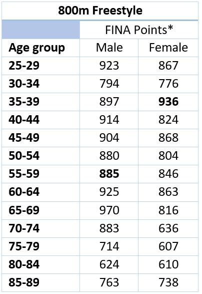 The table that follows sets out the FINA points achieved by the winning time in each age group.