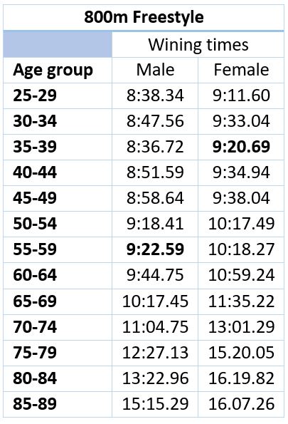 And now, turning to the winning times. The table below sets out the winning time in each age group. Times in Bold are the new LEN records.